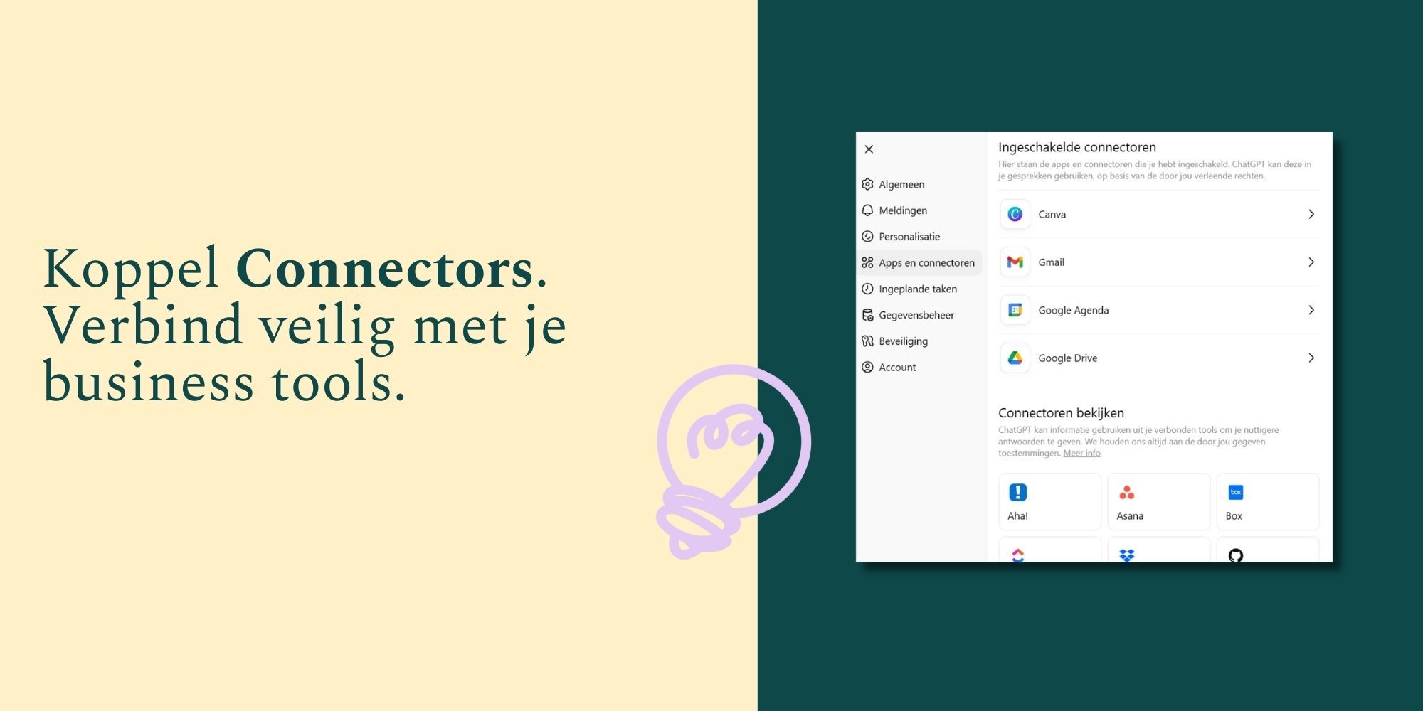 - Koppel Connectors. Verbind veilig met je business tools zoals Gmail, Teams en Hubspot.